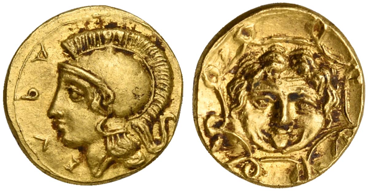 Sicily, Syracuse, 10 Litrai struck under the Second Democracy, ca. 405 BC. AV (g 0,70; mm 8; h 12). ΣYΡΑ, head of Athena l., wearing Attic crested helmet, Rv. Aegis with gorgoneion at centre. Rizzo, pl. XLVIII, n. 6; Weber 1608; SNG ANS 316; SNG Lloyd 1417; SNG Boston 440. Rare and in exceptional condition: fdc.