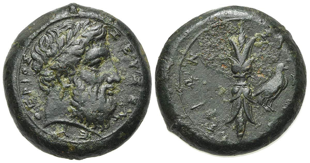 Sicily, Syracuse, Hemidrachm struck under Timoleon and the Third Democracy, ca. 344-317 BC. AE (g 16,06; mm 23; h 5). ΖΕΥΣ ΕΛ - ΕΥ - ΘΕΡΙΟΣ, Laureate head of Zeus Eleutherios r.; Rv. ΣYPAKOΣIΩN, Upright thunderbolt; to r., eagle standing r. CNS 72; SNG ANS 477-88; HGC 2, 1440. Some deposit, good very fine
