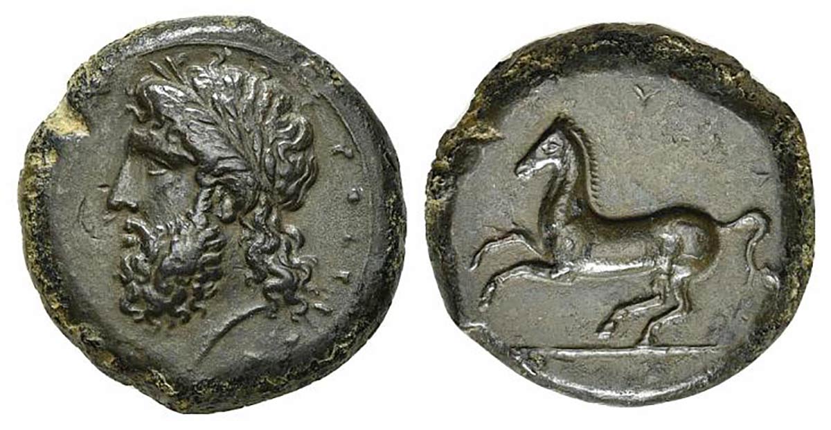 Sicily, Syracuse, Dilitron, c. 339/8-334 BC; AE (g 19,44; mm 26,5; h 3). ZEYΣ EΛEYΘEPIOΣ, Laureate head of Zeus Eleutherios l.; Rv. ΣYPAKOΣIΩN, Horse rearing l. CNS 80; SNG ANS 533-41; HGC 2, 1439. Extremely fine