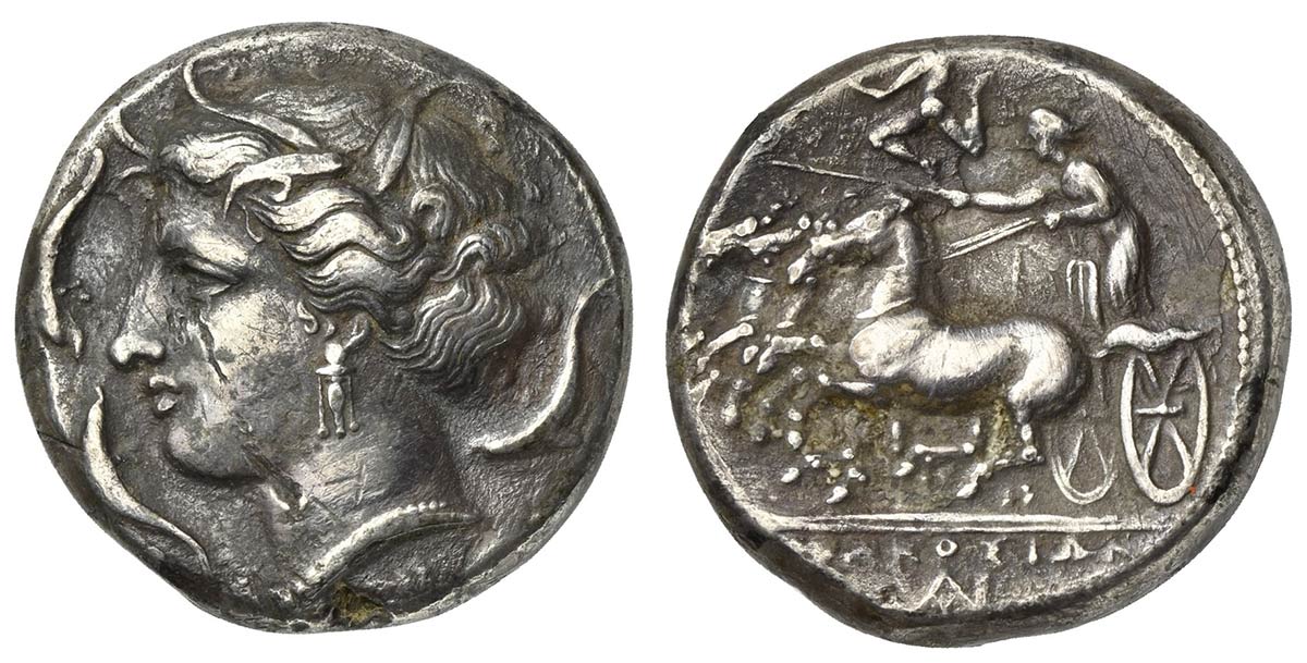 Sicily, Syracuse, Agathokles (317-289 BC); ca 317-310 BC; AR Tetradrachm (g 16,73; mm 24; h 10); Wreathed head of Arethusa l.; three dolphins around; [NI] below neck Rv. [ΣYPA]KOΣIΩN, Charioteer driving quadriga l.; triskeles abov