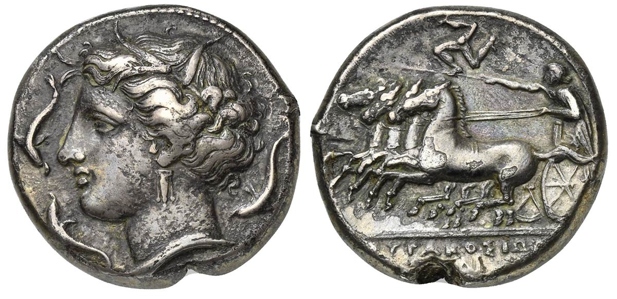 Sicily, Syracuse, Agathokles (317-289 BC); ca 317-310 BC; AR Tetradrachm (g 16,78; mm 25; h 12); Wreathed head of Arethusa l.; three dolphins around; [NI] below neck Rv. [ΣYPA]KOΣIΩN, Charioteer driving quadriga l.; triskeles abov