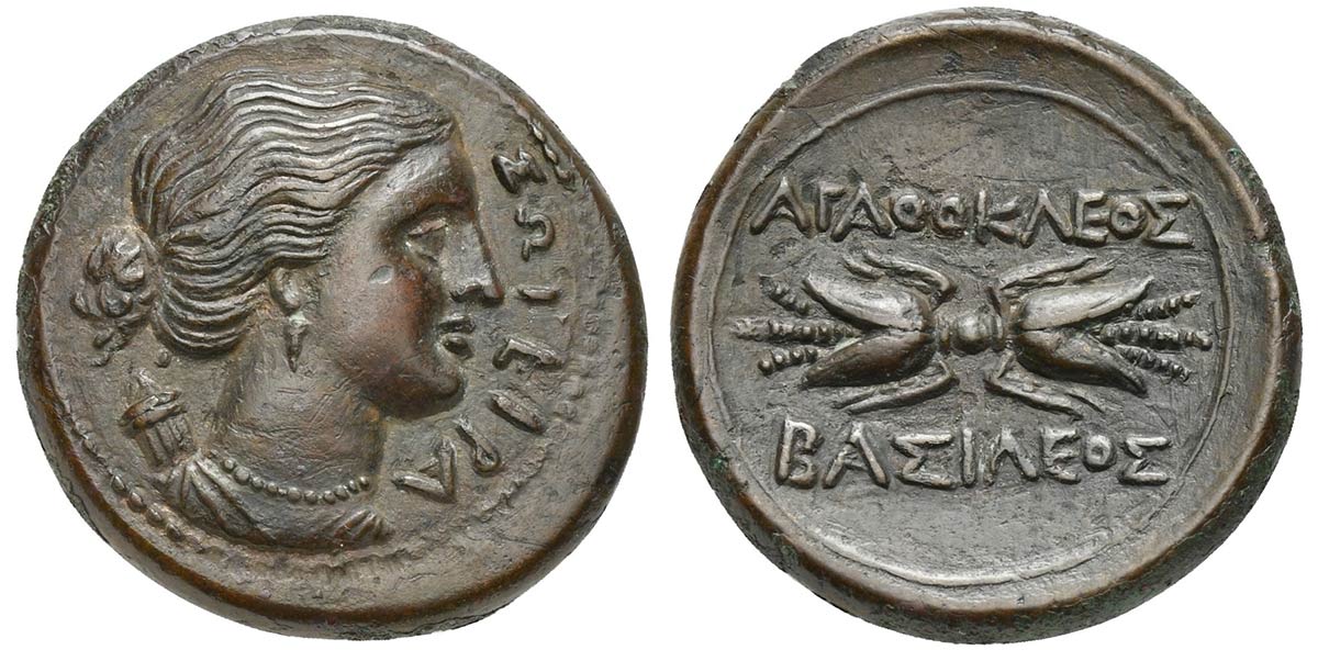 Sicily, Syracuse, Litra struck under Agathokles, ca. 317-289 BC. AE (g 9,86; mm 24; h 7). ΣΩTEIPA, head of Artemis Soteira r., quiver over shoulder, Rv. AΓAΘOKΛEOΣ BAΣIΛEOΣ, winged thunderbolt. CNS 142; SNG Copenhagen 779; SNG ANS