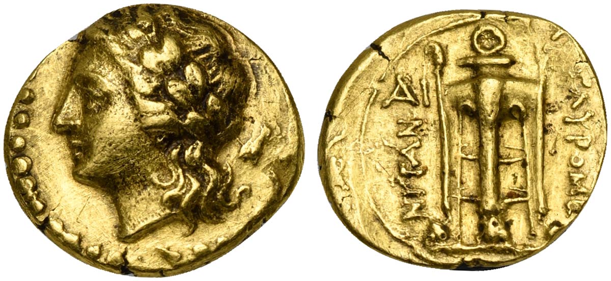 Sicily, Tauromenion, 1/8 Stater - Trihemiobol, ca. 214-212 BC; AV (g 1,13; mm 11; h 8); Laureate head of Apollo l.; bee behind Rv. TAYPOMENITAN, Tripod. SNG ANS 1115; HGC 2, 1571. Rare, good very fine