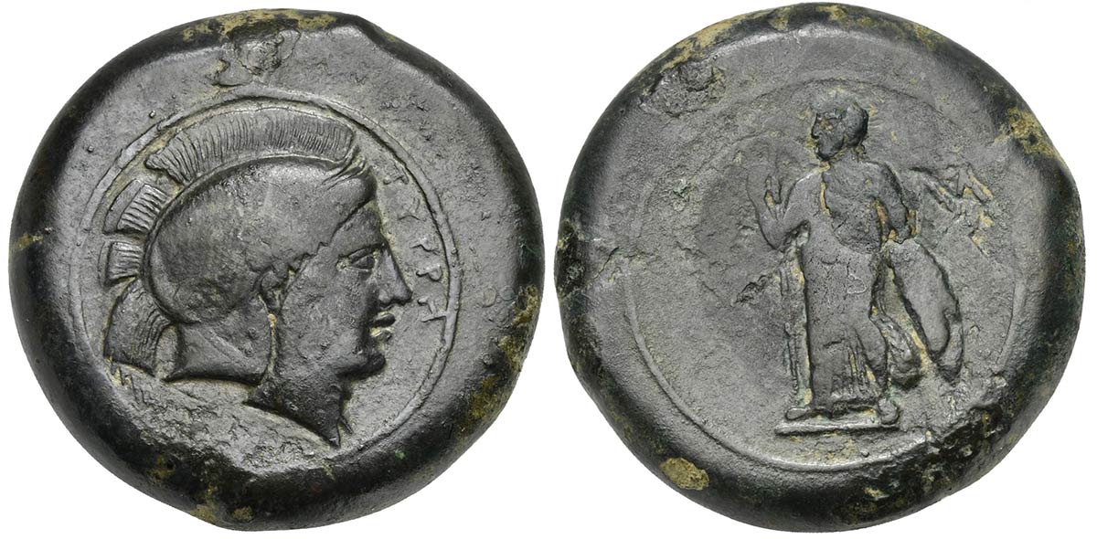 Sicily, Tyrrhenoi, 354/3-344 BC; AE (g 29,81; mm 30; h 3); TYPPH, Helmeted head of Athena r. Rv. Athena standing l., holding spear and shield; M to r. Campana 1; CNS 1; HGC 2, 1657. Rare, good very fine