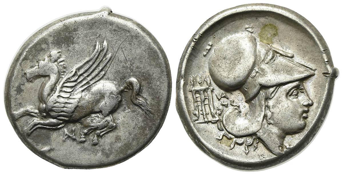 Akarnania, Anaktorion, Stater, ca. 350-300 BC; AR (g 8,44; mm 21; h 9). Pegasos flying l.; AN monogram below; Rv. Helmeted head of Athena r.; tripod and AN monogram behind. Pegasi 27; BCD Akarnania -. Graffiti, very fine