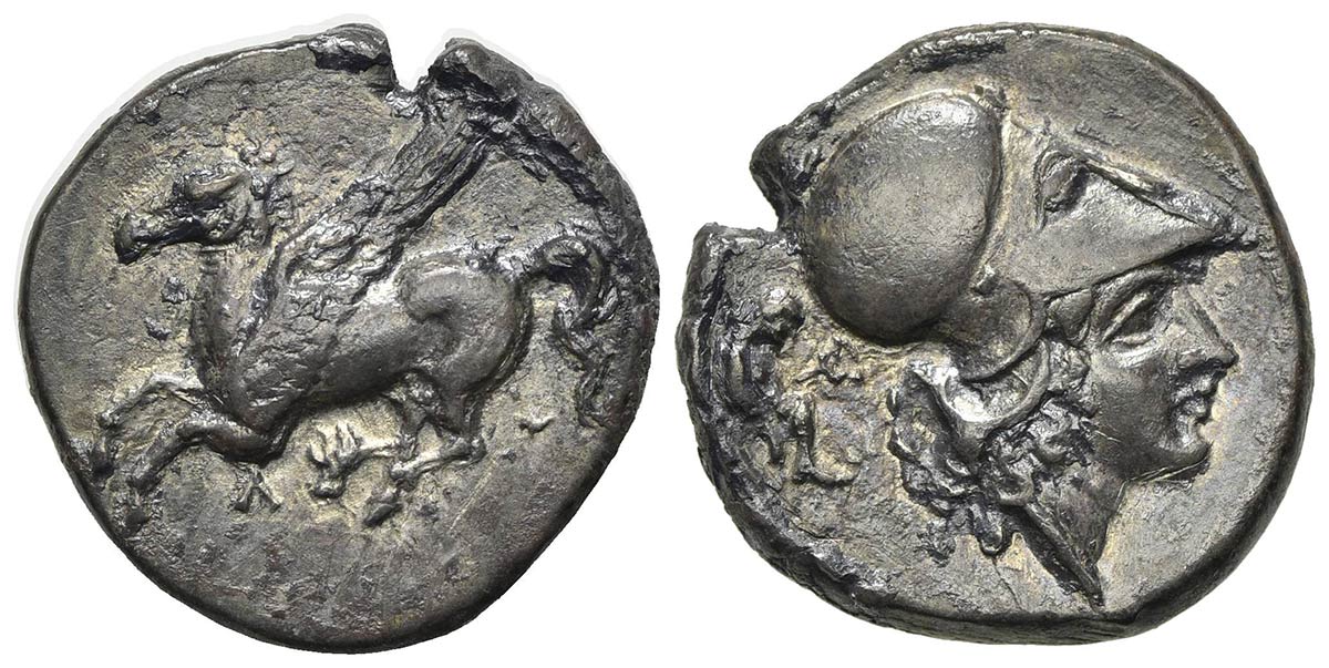 Akarnania, Leukas, Stater, ca. 320-280 BC; AR (g 8,28; mm 21; h 2). Pegasos flying l.; Λ below; Rv. Helmeted head of Athena r.; to l., Λ and Hermes standing r., fastening his sandal. Pegasi 99; BCD Akarnania 276; SNG Copenhagen 34