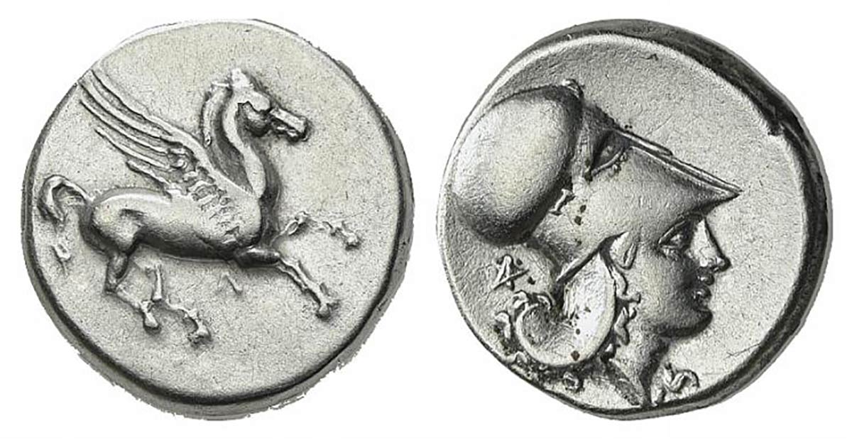 Akarnania, Leukas, Stater, ca. 350-320 BC; AR (g 8,47; mm 20; h 5). Pegasos flying r.; Λ below; Rv. Helmeted head of Athena r.; pentagram behind. Pegasi 114. Very fine