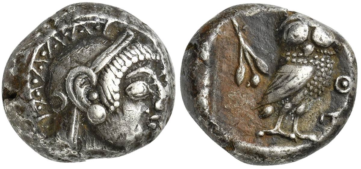 Attica, Athens, Tetradrachm, ca. 500-480 BC. AR (g 17,11; mm 21; h 6). Head of Athena r., wearing crested helmet decorated with chevron and dot pattern, Rv. AΘE, owl, with closed wings, standing r. with head facing; on l., crescent and olive twig with two leaves and one berry; all within incuse square. Seltman Group M & G; Asyut Group IV; HGC 1590; Group H. Svoronos pl. 4, 32. Cabinet tone, about extremely fine.