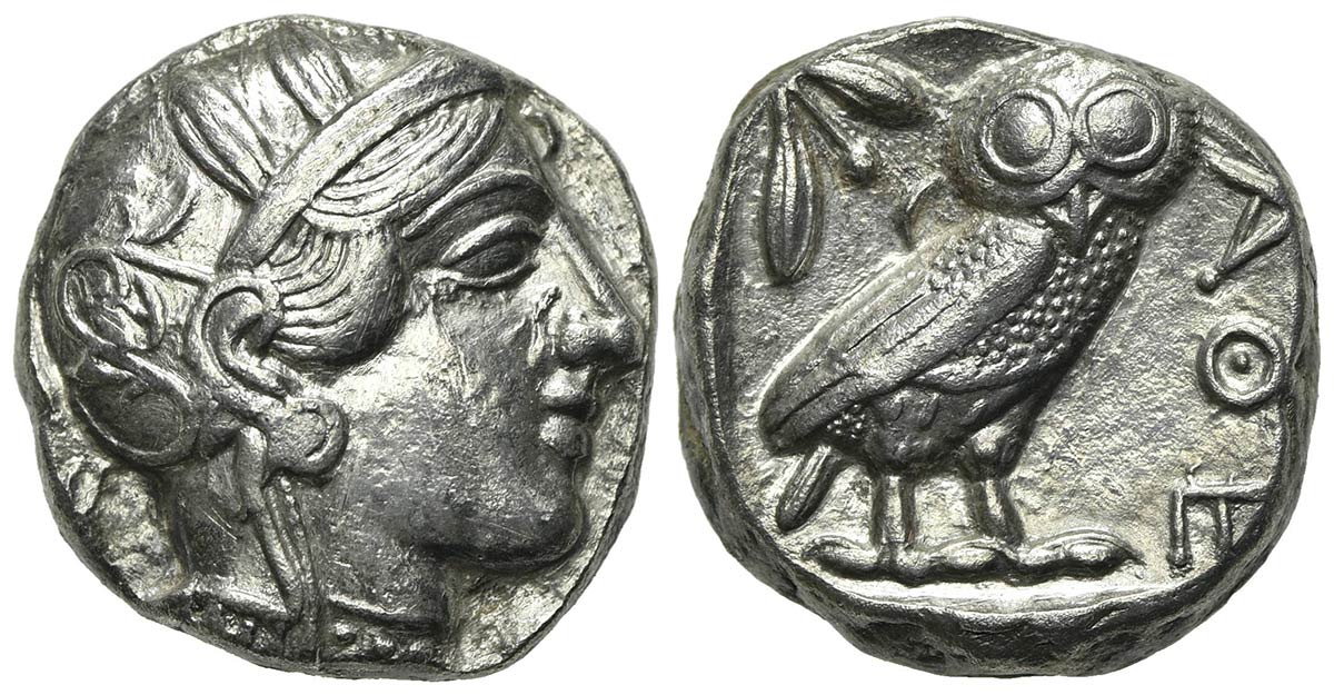 Attica, Athens, Tetradrachm, ca. 454-404 BC. AR (g 16,86; mm 22; h 9). Helmeted head of Athena r.; Rv. AΘE, Owl standing r., head facing; olive sprig behind; all within incuse square. Kroll 8; SNG Copenhagen 31. Nick on obv., near extremely fine