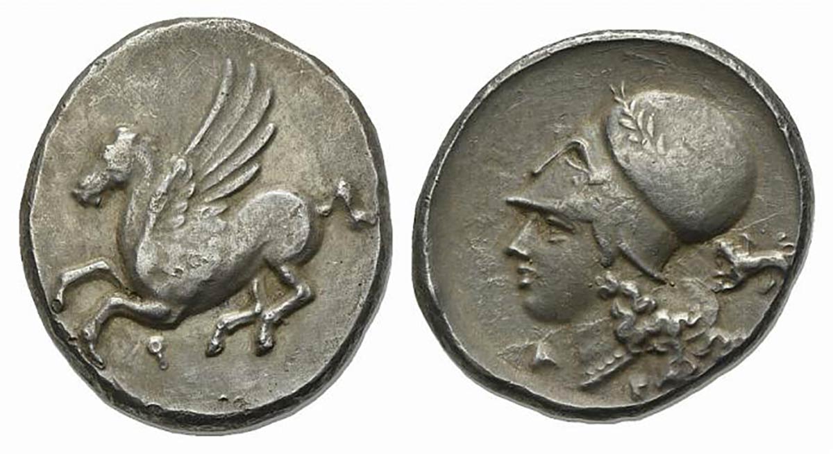 Corinth, Stater, ca. 375-300 BC; AR (g 8,40; mm 20,5; h 3). Pegasos flying l.; koppa below; Rv. Helmeted head of Athena l., wearing Corinthian helmet decorated with laurel wreath; chimaera behind. Pegasi 428; BCD Corinth 102. Good very fine
