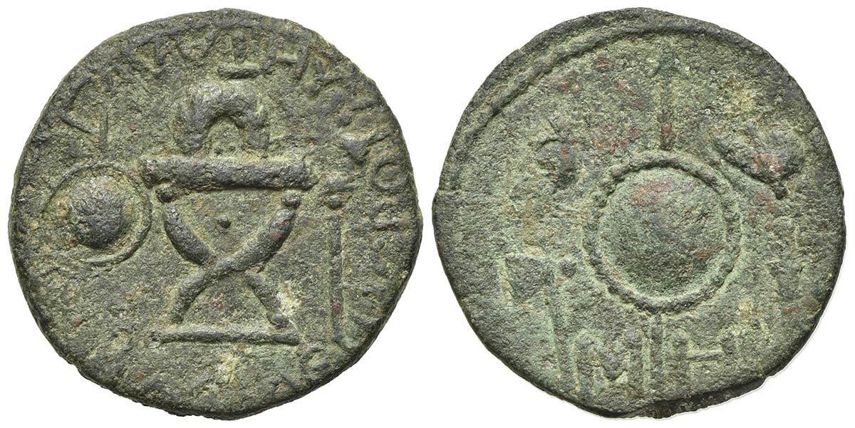 Lotto 503 | Kings of Bosporos, Sauromates I (AD 93/4-123/4), 48 units; AE (g 8.21; mm 24; h 12). Central shield with sword in scabbard to r., war axe to l., spear behind, helmet to upper r. and horse's head, to upper l.; M - H (mark of value)