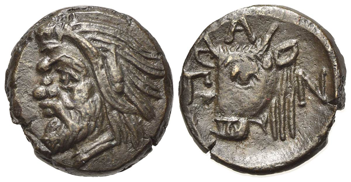 Cimmerian Bosporos, Pantikapaion, ca. 325-310 BC; AE (g 3,84; mm 16,5; h 12). Head of satyr l.; Rv. ΠAN, Head of bull l. Anokhin 1046; MacDonald 67. Near extremely fine