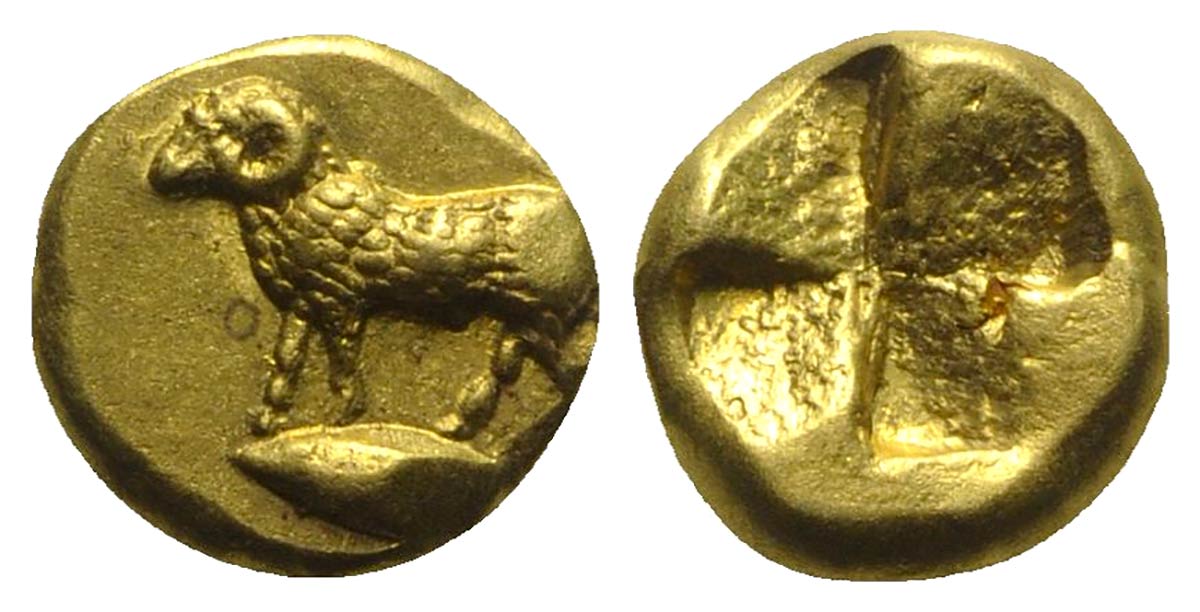 Mysia, Kyzikos, Hekte – Sixth Stater, ca. 500-450 BC; EL (g 2,67; mm 9). Ram standing l. on tunny l.; Rv. Quadripartite incuse square. Von Fritze I 91; SNG BnF 228. Extremely fine