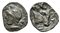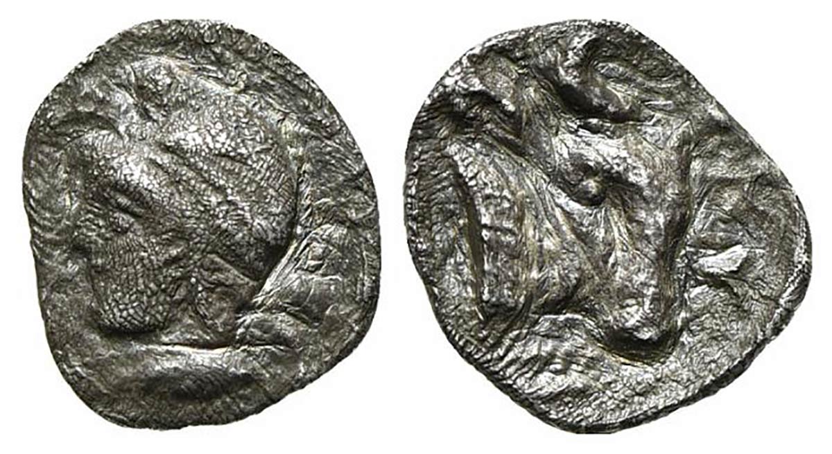 Mysia, Kyzikos, Hemiobol, ca. 450-400 BC; AR (g 0,27; mm 7; h 1). Head of Attis l., wearing Phrygian cap; Rv. Head of bull facing slightly r. Von Fritze II 23; SNG BnF -; SNG von Aulock 7336. Good Fine