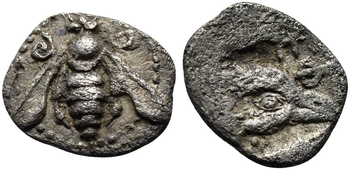 Ionia, Ephesos, Tetartemorion, ca. 500-420 BC; AR (g 0,19; mm 7; h 2); Bee with slightly curved wings; Rv. EΦ, Head of eagle r. within incuse square. Karwiese Series IV, Type 2; SNG Kayhan 126-9. Good very fine