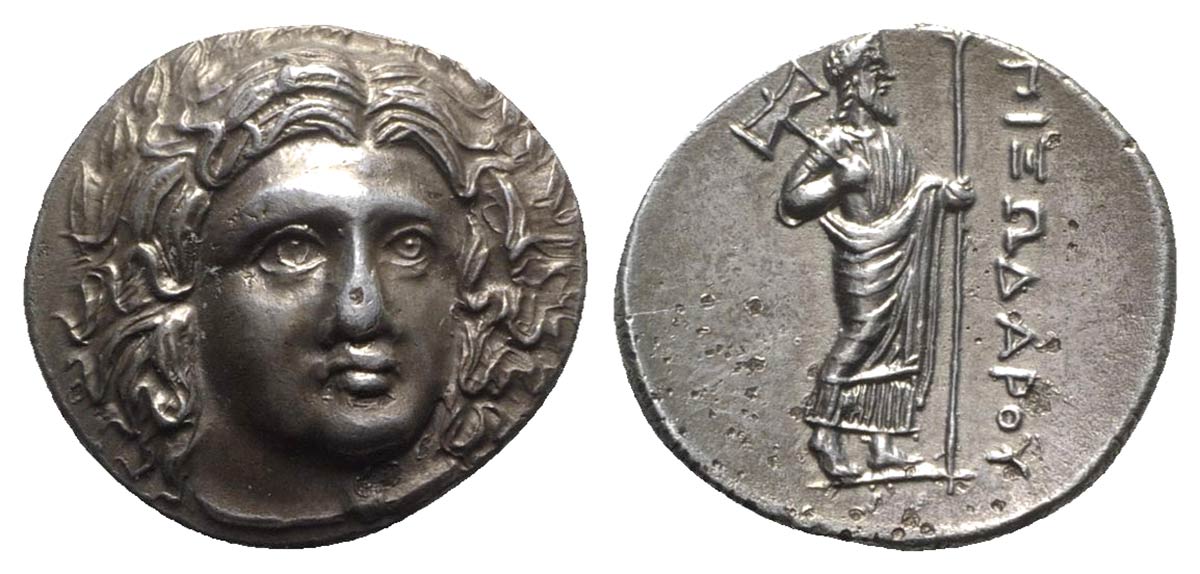 Satraps of Caria, Pixodaros (ca. 341/0-336/5 BC); AR Didrachm (g 6,95; mm 21; h 12). Halikarnassos mint. Laureate head of Apollo facing slightly r., drapery at neck; Rv. ΠIΞΩΔAPOY, Zeus Labraundos standing r., holding sceptre. Konuk, Identities 30; Babelon, Perses 414–21; Traité II 111; SNG Copenhagen 597. Extremely fine