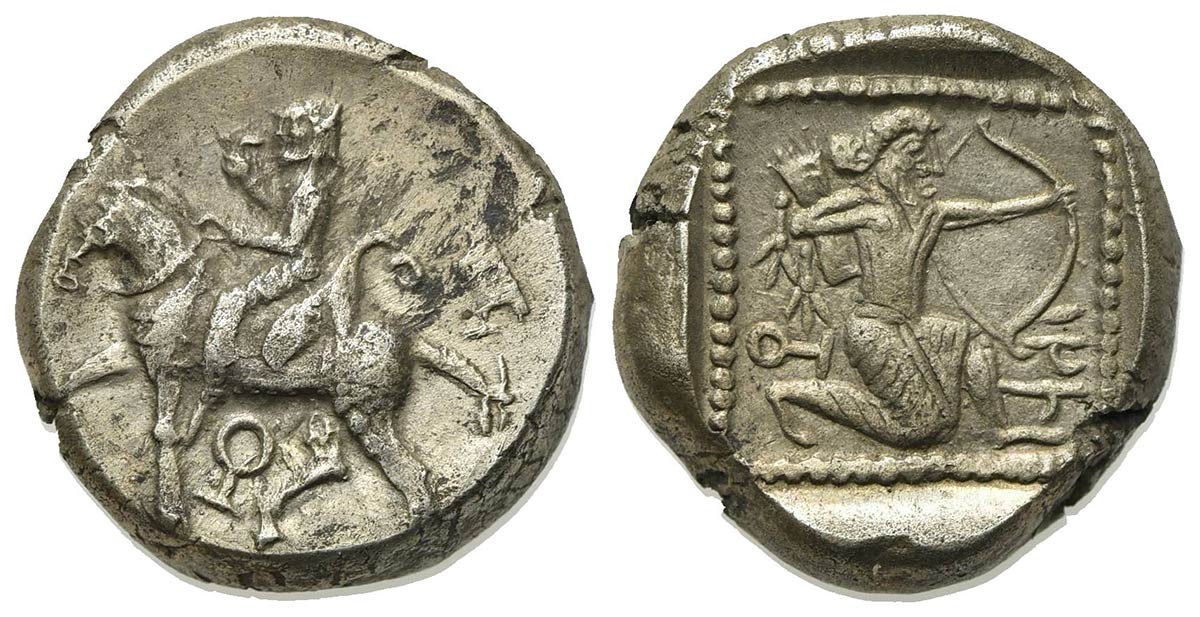 Cilicia, Tarsos, Stater, ca. 420-410 BC. AR (g 10.01, mm 19, h 6). Horseman riding l., holding flower; monogram below; Rv.Archer kneeling r., drawing bow; tree and monogram to l.; all in dotted square within incuse square. SNG BnF