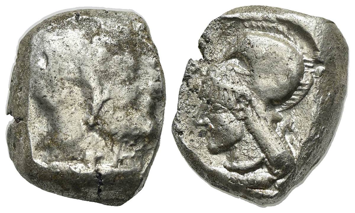 Cyprus Lapethos, Uncertain king, ca. 425 BC; AR Stater (g 10.21; mm 14.5; h 6). Helmeted head of Athena l.; Rv. Head of Herakles r., wearing lion skin, within incuse square. Zapiti & Michaelidou 3. Rare, good fine
