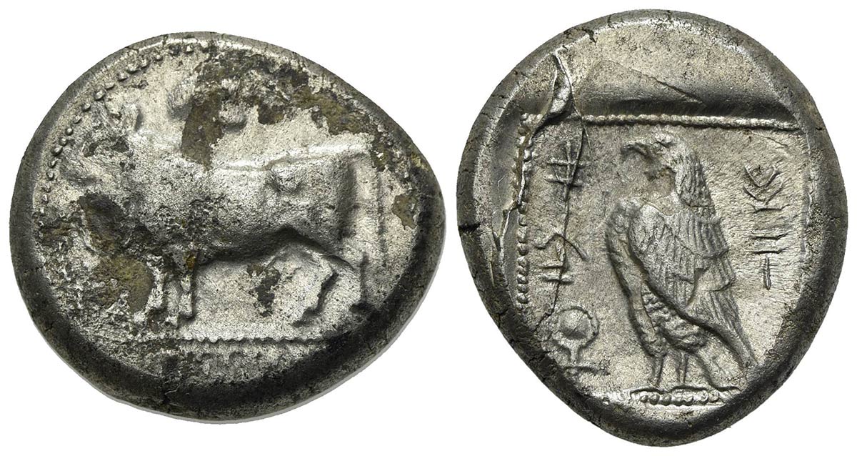 Cyprus Paphos. Onasi[...], Stater, mid 5th century BC. AR (g 10.86, mm 22, h 3). Bull standing l. on beaded double line; winged solar disk above, ankh to l.; all within dotted circular border; Rv. Eagle standing l.; ankh to l.; al