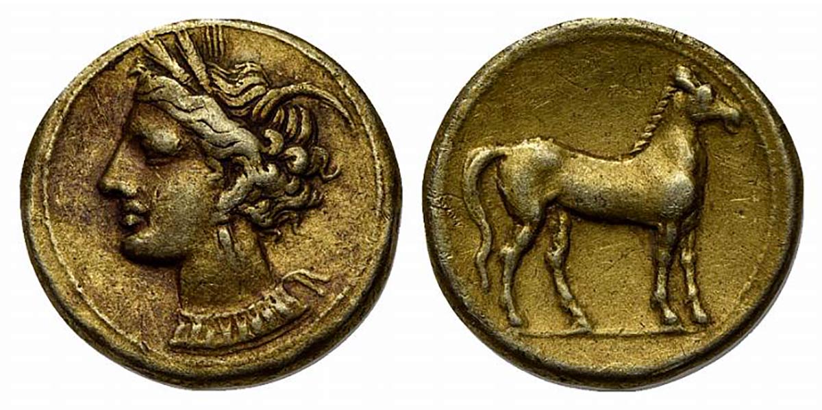 North Africa, Carthage, Stater, ca. 290-270 BC. EL (g 7,36; mm 20; h 12). Head of Tanit l., wearing wreath of grain ears; Rv. Horse standing r. Jenkins & Lewis Group VI. Very fine