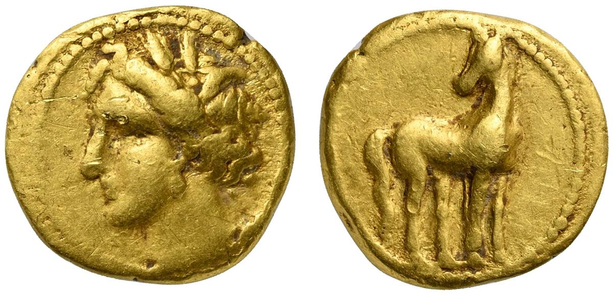 North Africa, Carthage, ca. 205-201 BC; EL (g 1,84; mm 11; h 12); Wreathed head of Tanit l., Rv. Horse standing r., head l. Jenkins & Lewis Group XIII, 462. Very rare, very fine