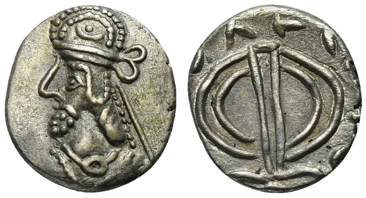 Kings of Persis, Uncertain king, Hemidrachm, 1st century BC – 1st century AD; AR (g 1,23; mm 13; h 6); Bearded bust l., wearing diadem with two loop tie and Parthian-style tiara; Rv. Diadem. Alram 619. Extremely fine