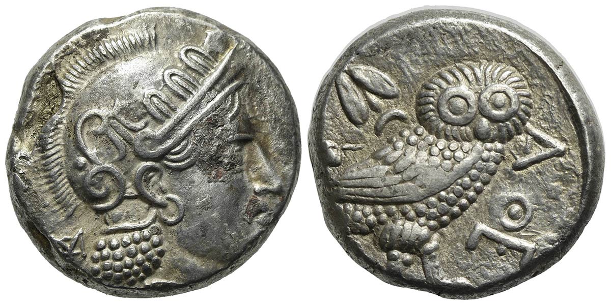 Pre-Seleukid Baktria, Tetradrachm, ca. 325-300 BC. AR (g 16,58; mm 23; h 8). Imitating Athens. Helmeted head of Athena r.; monogram behind; Rv. AΘE, Owl standing r., head facing; olive sprig, crescent behind and grape bunch to l.
