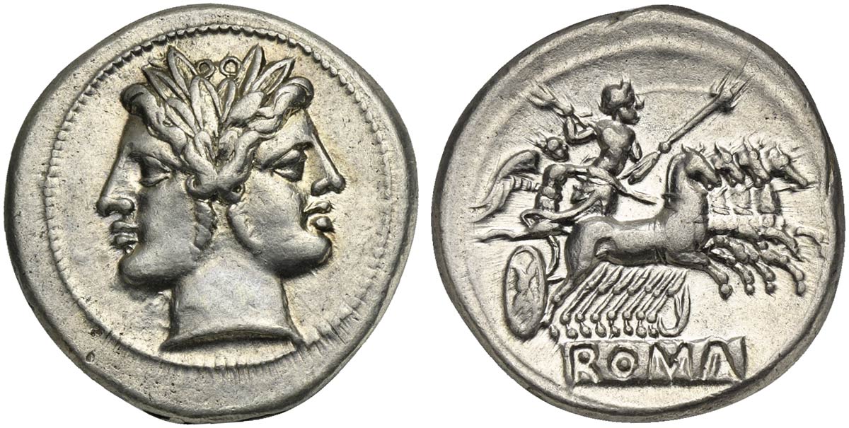 Anonymous, Didrachm - Quadrigatus, Rome, ca. 225-212 BC. AR (g 6,66; mm 23; h 5). Laureate head of Janus, Rv. Jupiter, holding sceptre and thunderbolt, in quadriga r. driven by Victory; incuse ROMA in raised tablet below. Crawford