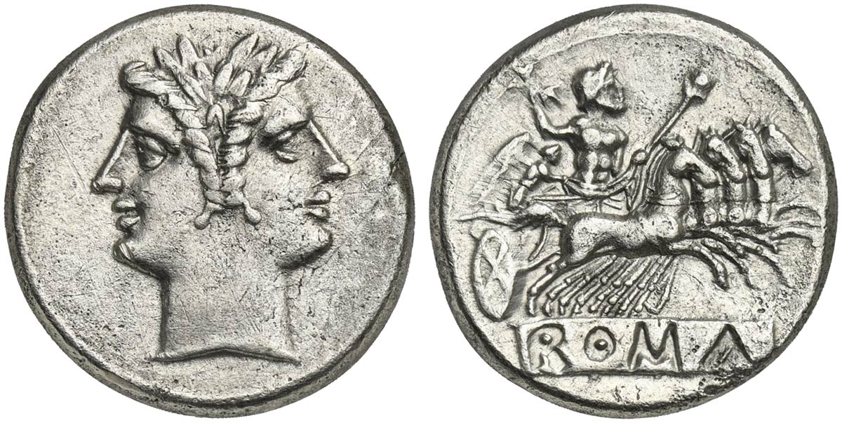 Anonymous, Didrachm - Quadrigatus, Rome, ca. 225-212 BC. AR (g 6,53; mm 21; h 6). Laureate head of Janus, Rv. Jupiter, holding sceptre and thunderbolt, in quadriga r. driven by Victory; incuse ROMA in raised tablet below. Crawford