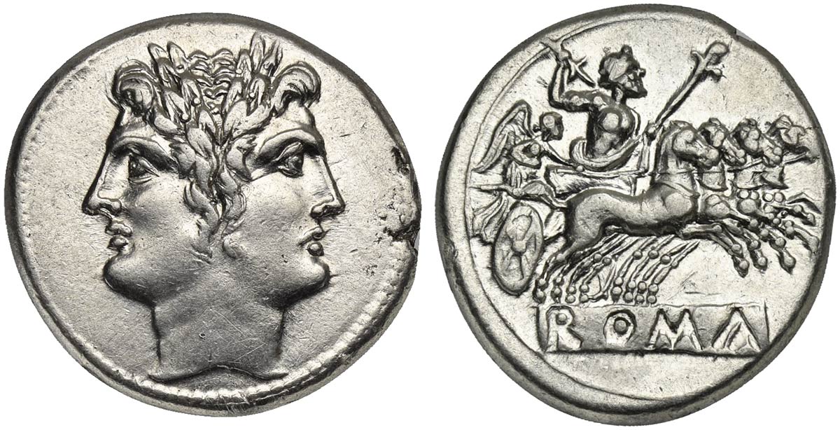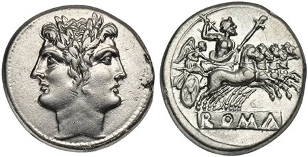 Anonymous, Didrachm - Quadrigatus, Rome, ca. 225-212 BC. AR (g 6,67; mm 22; h 7). Laureate head of Janus, Rv. Jupiter, holding sceptre and thunderbolt, in quadriga r. driven by Victory; incuse ROMA in raised tablet below. Crawford