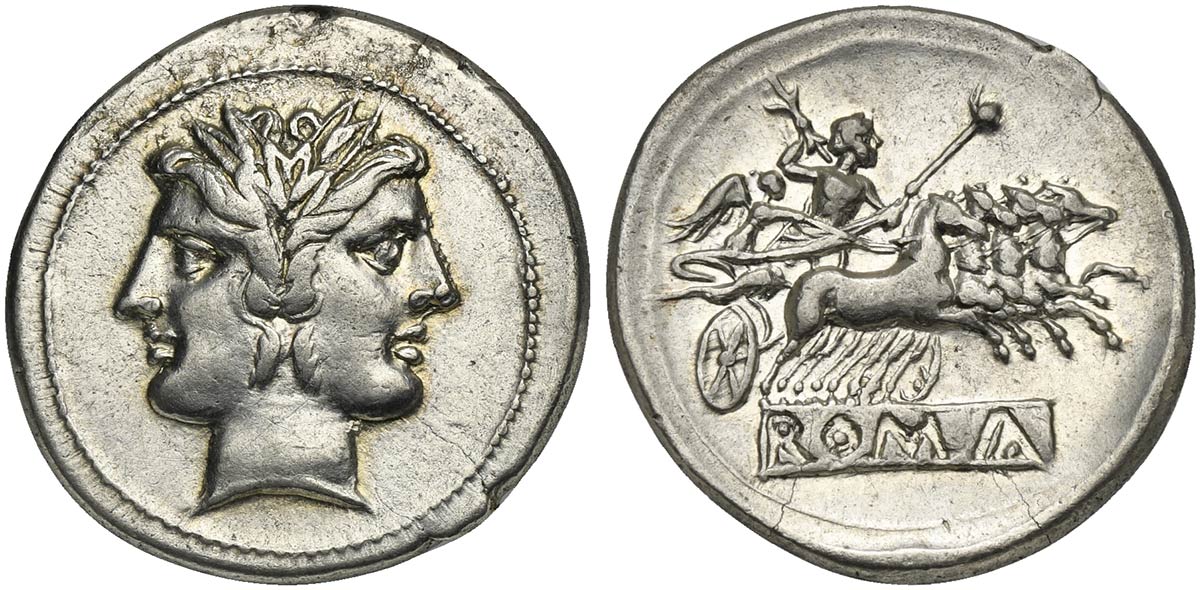 Anonymous, Didrachm - Quadrigatus, Rome, ca. 225-212 BC. AR (g 6,57; mm 24; h 6). Laureate head of Janus, Rv. Jupiter, holding sceptre and thunderbolt, in quadriga r. driven by Victory; incuse ROMA in raised tablet below. Crawford