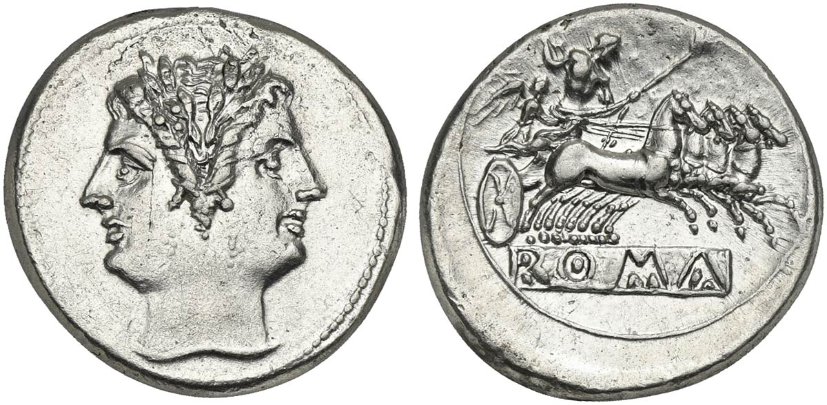 Anonymous, Didrachm - Quadrigatus, Rome, ca. 225-212 BC. AR (g 6,70; mm 23; h 6). Laureate head of Janus, Rv. Jupiter, holding sceptre and thunderbolt, in quadriga r. driven by Victory; incuse ROMA in raised tablet below. Crawford