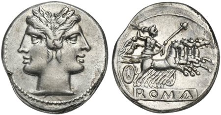 Anonymous, Didrachm - Quadrigatus, Rome, ca. 225-212 BC. AR (g 6,55; mm 22; h 5). Laureate head of Janus, Rv. Jupiter, holding sceptre and thunderbolt, in quadriga r. driven by Victory; incuse ROMA in raised tablet below. Crawford