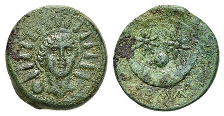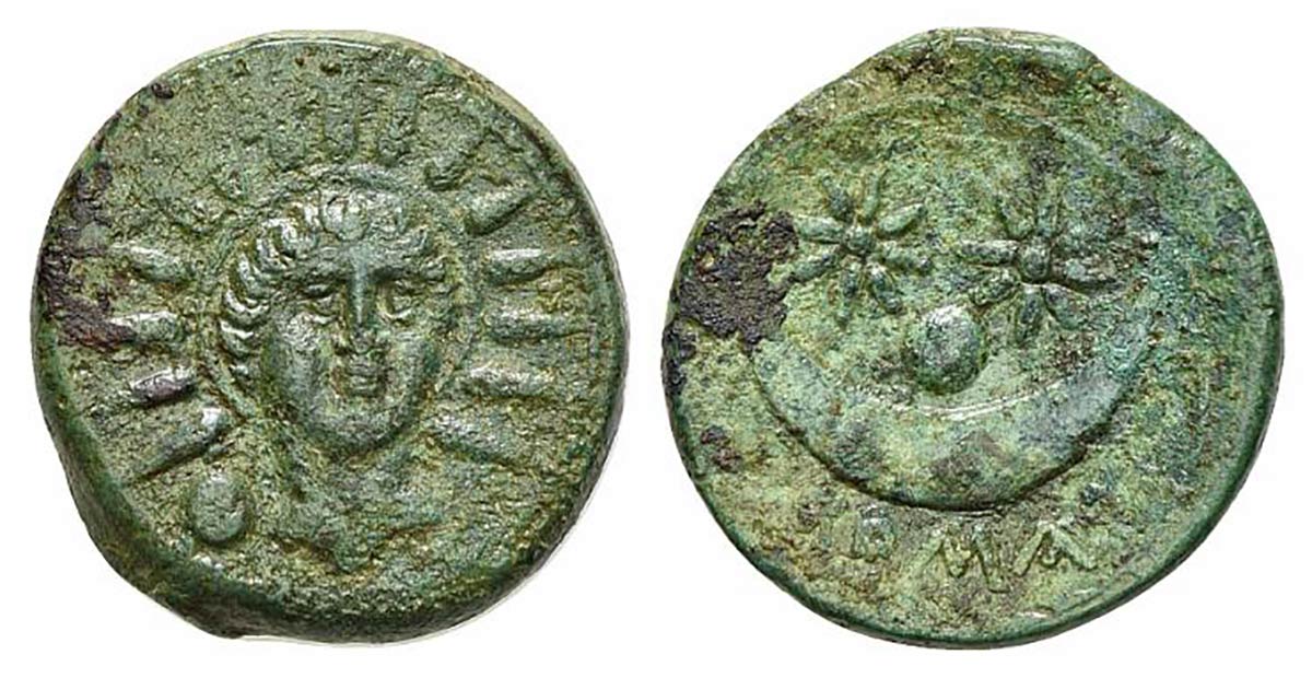 Anonymous, Rome, Uncia, ca. 217-215 BC. AE (g 11,40; mm 23,5; h 4). Radiate and draped facing bust of Sol; Rv. Crescent; above, two stars, ROMA below. Crawford 39/4; RBW 108. Green patina, near very fine