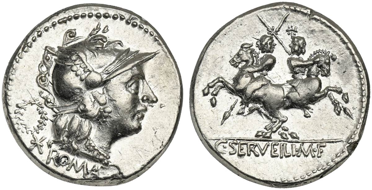 C. Servilius M.f., Denarius, Rome, 136 BC. AR (g 3,95; mm 21; h 6). Head of Roma r., wearing winged helmet; wreath and denomination mark behind, Rv. Dioscuri riding in opposite directions, each holding couched spear, stars above;
