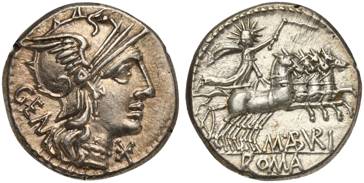 M. Aburius M.f. Geminus, Denarius, Rome, 132 BC. AR (g 3,92; mm 19; h 8). Helmeted head of Roma r., GEM behind, denomination mark below chin, Rv. Sol driving quadriga r.; M•(AB)(VR)I below, ROMA in exergue. Crawford 250/1; Aburia