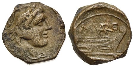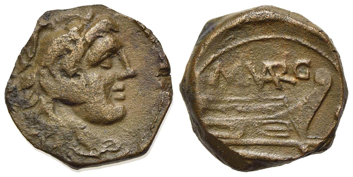 M. Vargunteius, Quadrans, Rome, 130 BC. AE (g 3,74; mm 16; h 8). Head of Hercules r., wearing lion skin; Rv. Prow of galley r.; M. (VAR)G above, three pellets to r., ROMA below. Crawford 257/4; Sydenham 508b. Brown patina, good ve