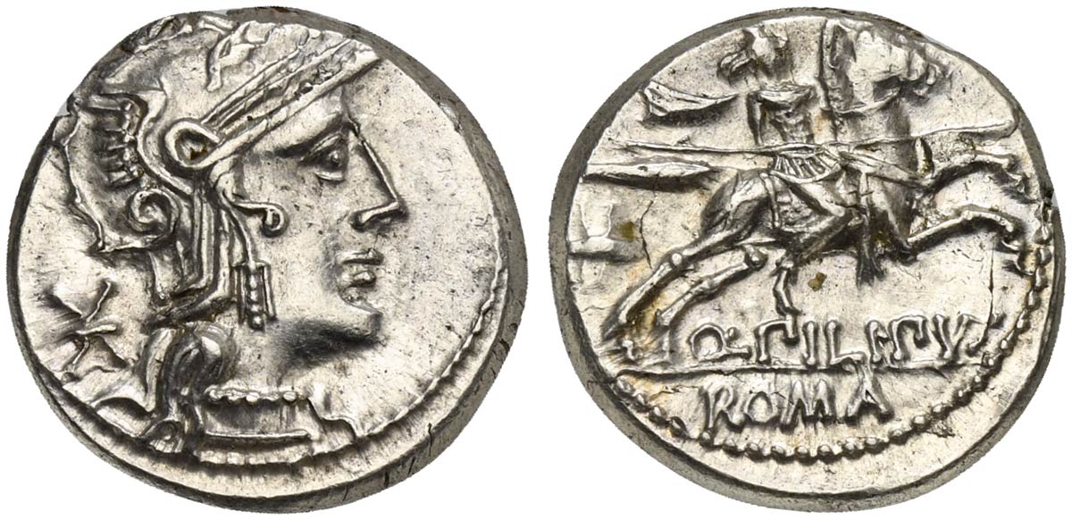 Q. Philippus, Denarius, Rome, 129 BC. AR (g 3,87; mm 18; h 11). Head of Roma r., wearing winged helmet, triple-drop earring, and pearl necklace; denomination mark behind, Rv. Macedonian horseman galloping r., holding couched spear