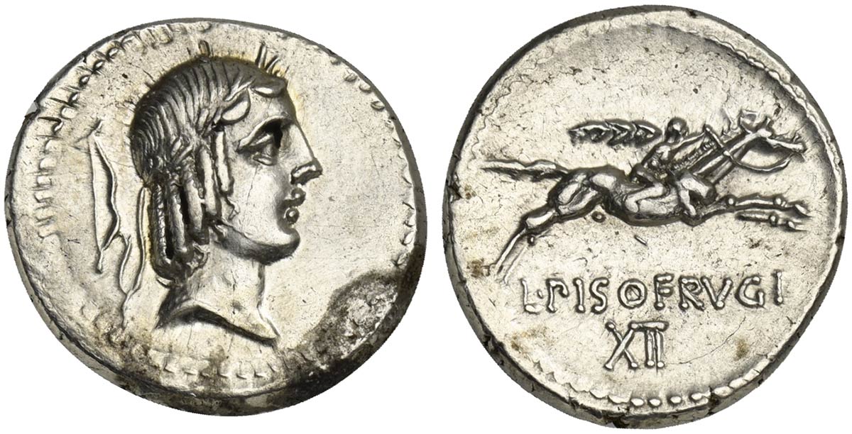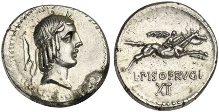 L. Calpurnius Piso Frugi, Denarius, Rome, 90 BC. AR (g 3,98; mm 19; h 7). Laureate head of Apollo r.; bow behind, Rv. Naked horseman galloping r., carrying long palm; L•PISO•FRVGI / XII below. Crawford 340/1; Calpurnia 11; Sydenha