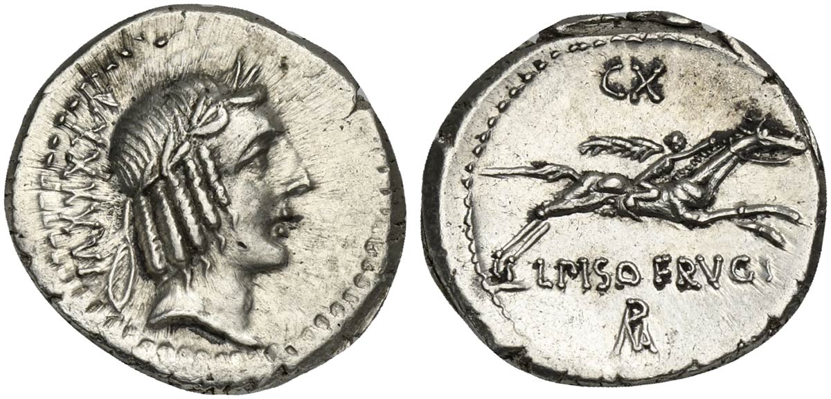 L. Calpurnius Piso Frugi, Denarius, Rome, 90 BC. AR (g 3,84; mm 19; h 11). Laureate head of Apollo r.; control behind, Rv. Horseman galloping r., holding palm branch and reins; control above, L•PISO•FRVGI / ROMA monogram below. Cr