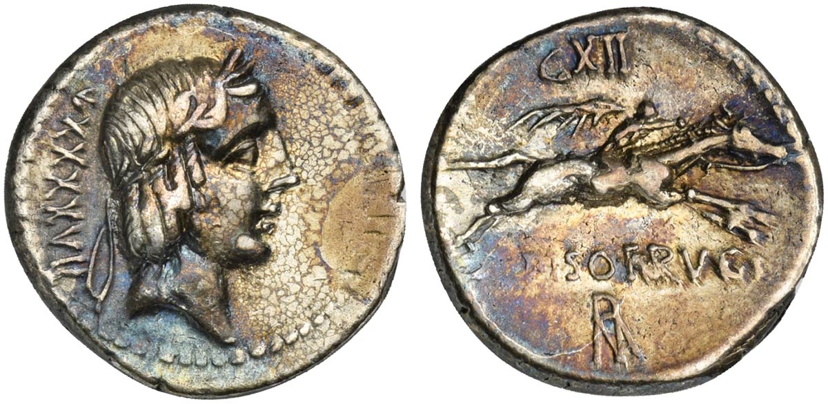 L. Calpurnius Piso Frugi, Denarius, Rome, 90 BC. AR (g 3,89; mm 19; h 5). Laureate head of Apollo r.; control behind, Rv. Horseman galloping r., holding palm branch and reins; control above, L•PISO•FRVGI / ROMA monogram below. Cra