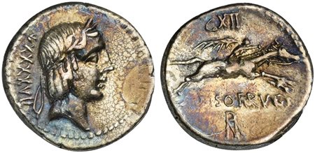 L. Calpurnius Piso Frugi, Denarius, Rome, 90 BC. AR (g 3,89; mm 19; h 5). Laureate head of Apollo r.; control behind, Rv. Horseman galloping r., holding palm branch and reins; control above, L•PISO•FRVGI / ROMA monogram below. Crawford 340/1; Calpurnia 12; Sydenham 661. Iridescent patina, good very fine