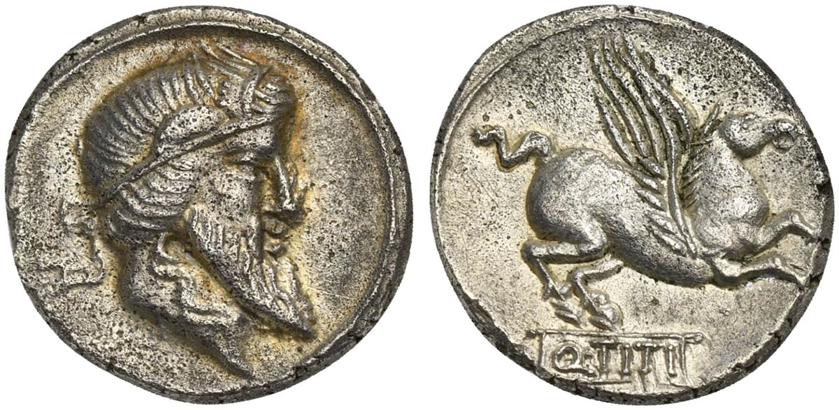 Q. Titius, Denarius, Rome, 90 BC. AR (g 3,65; mm 18; h 3). Bearded head of Mutinus Titinus r., wearing winged diadem, Rv. Pegasus springing r. from inscribed tablet; Q•TITI. Crawford 341/1; Titia 1; Sydenham 691. Very fine