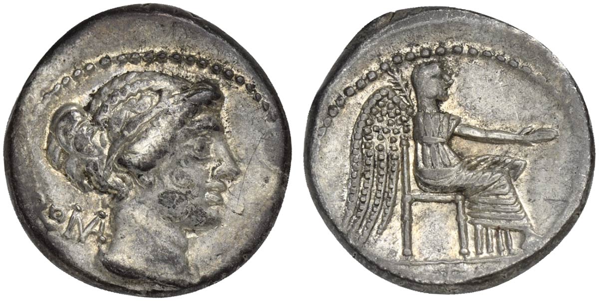 M. Porcius Cato, Denarius, Rome, 89 BC. AR (g 3,93; mm 18; h 12). Draped female bust r.; behind, ROMA; below, M CATO, Rv. Victory seated r., holding patera and palm branch; in ex. VICTRIX. Crawford 343/1b; Porcia 5; Sydenham 596.