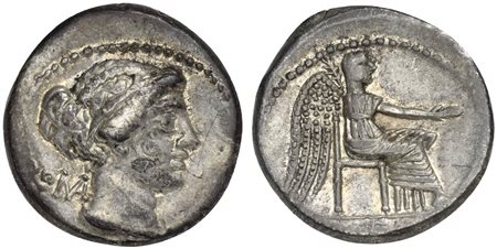M. Porcius Cato, Denarius, Rome, 89 BC. AR (g 3,93; mm 18; h 12). Draped female bust r.; behind, ROMA; below, M CATO, Rv. Victory seated r., holding patera and palm branch; in ex. VICTRIX. Crawford 343/1b; Porcia 5; Sydenham 596. Cabinet tone and about extremely fine.