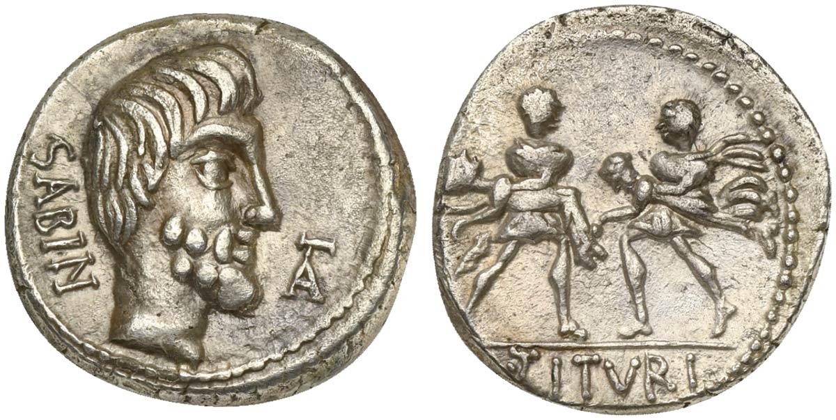 L. Titurius L.f. Sabinus, Denarius, Rome, 89 BC. AR (g 3,60; mm 18; h 8). Bareheaded and bearded head of King Tatius r.; SABIN behind, ligate TA (for Tatius) to r., Rv. Two soldiers, facing each other, each carrying off a Sabine w