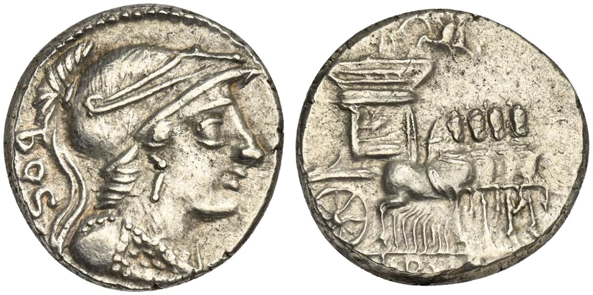 L. Rubrius Dossenus, Denarius, Rome, 87 BC. AR (g 4,08; mm 17; h 3). Helmeted bust of Minerva r., wearing aegis; DOS behind, Rv. Triumphal quadriga r., surmounted by Victory in biga r.; L•RV[BRI] in exergue. Crawford 348/3; Rubria 3; Sydenham 707. Good very fine