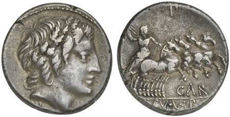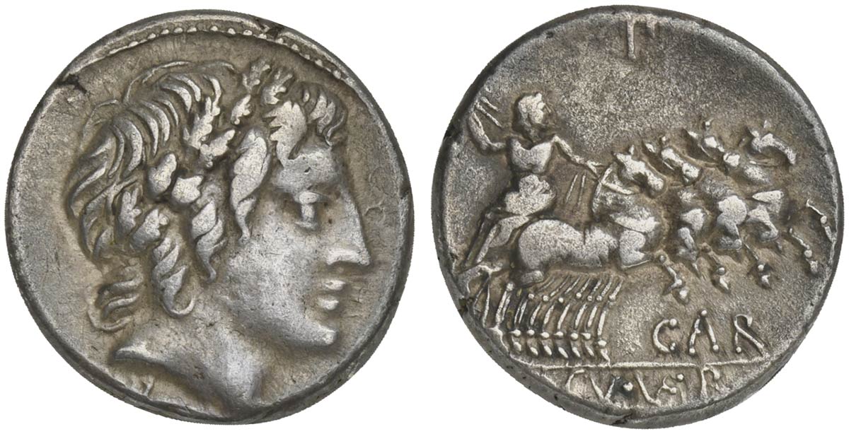 Gargilius (or Gargonius), Vergilius, and Ogulnius, Denarius, Rome, 86 BC. AR (g 3,91; mm 18; h 1). Laureate head of Apollo Vejovis or Jupiter r.; thunderbolt below, Rv. Jupiter, holding thunderbolt, driving quadriga r.; control ma