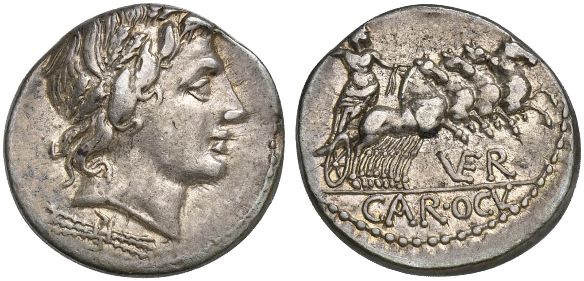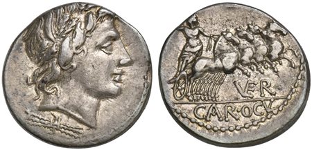 Vergilius, Gargilius, and Ogulnius, Denarius, Rome, 86 BC. AR (g 3,82; mm 19; h 12). Head of Apollo r., wearing oak wreath; thunderbolt below, Rv. Jupiter, wielding thunderbolt, driving quadriga r.; (VE)R below, GAR•OG(VL) in exer