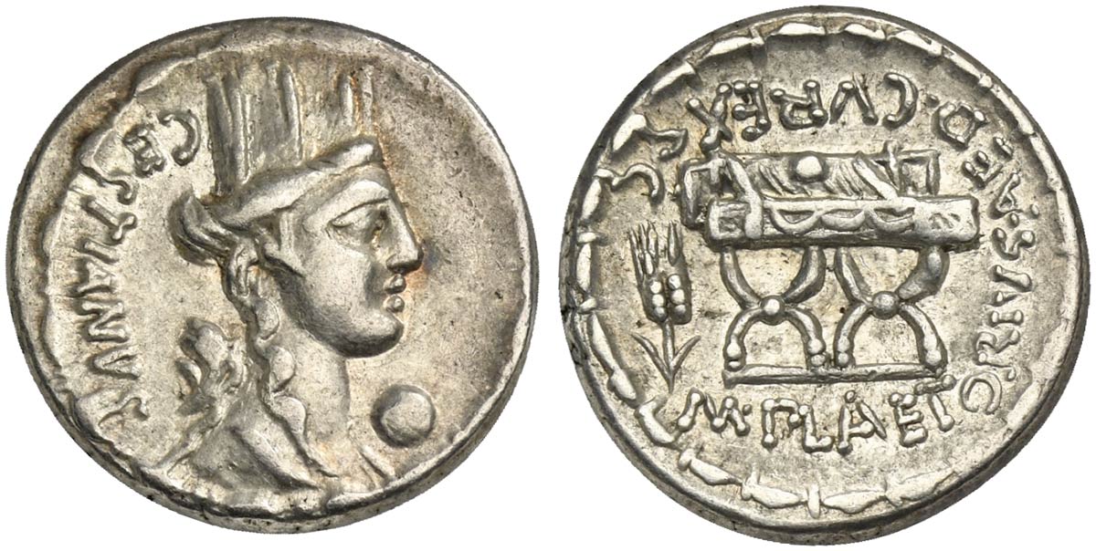 M. Plaetorius M.f. Cestianus, Denarius, Rome, 57 BC. AR (g 3,93; mm 19; h 7). Turreted and draped bust of Cybele r.; globe below chin, forepart of lion behind; CESTIANVS behind, Rv. Curule chair; grain-ear to l.; M•PLAETORIVS•AED•